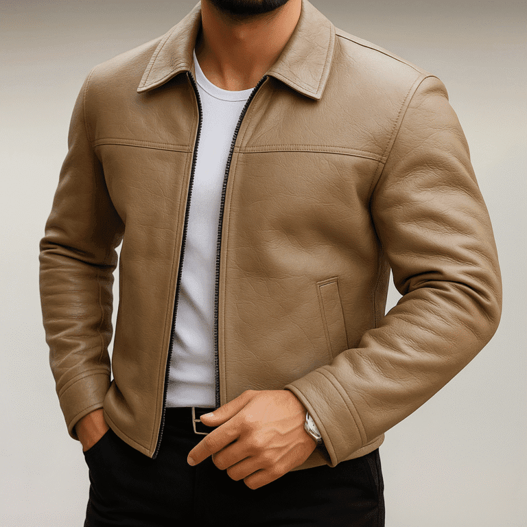 A light beige leather jacket with a timeless silhouette. Its versatile tone pairs seamlessly with both smart and casual fits, adding a refined touch to your wardrobe.