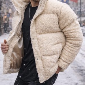 A premium beige teddy jacket designed for cold winter days. Crafted with a soft sherpa-style texture and a warm insulated interior, this jacket offers exceptional comfort and warmth. Its relaxed modern fit makes it perfect for everyday urban wear during winter.
