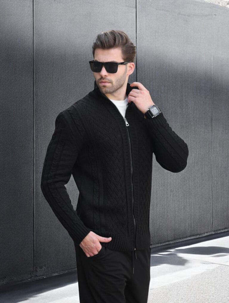 The Black Cable-Knit Zip Sweater offers a sophisticated yet casual appeal. Designed with fine knit detailing, it pairs seamlessly with both denim and tailored trousers.