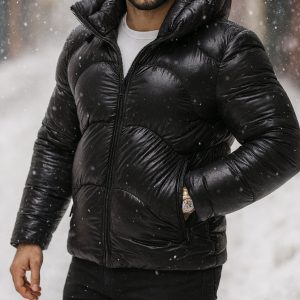 A premium black glossy puffer jacket designed for maximum warmth and bold urban style. Crafted with a water-resistant shiny exterior and thick insulation, this jacket offers excellent protection against cold, wind, and snow. The modern padded structure and integrated hood create a powerful winter silhouette, ideal for everyday city wear.