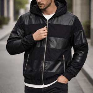 A modern hooded puffer jacket designed for urban everyday wear in colder seasons. The combination of padded construction and synthetic leather-look panels creates a bold, contemporary appearance while ensuring warmth and comfort. Ideal for casual and streetwear styling.