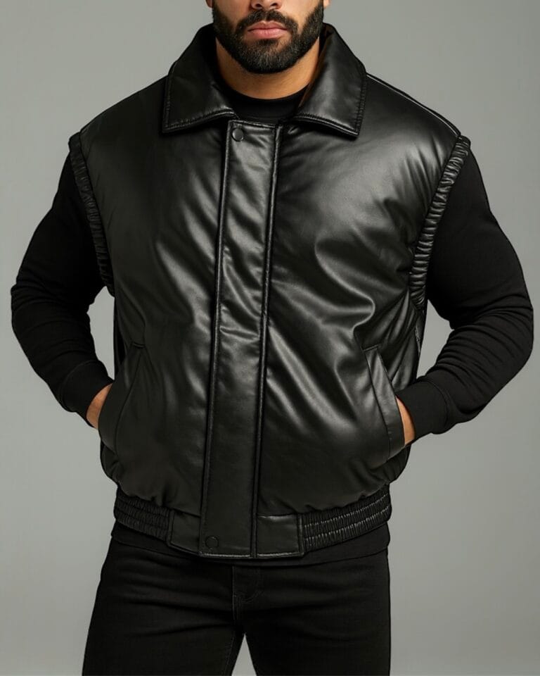 A bold outer layer that blends street style with modern sophistication. Crafted from smooth faux leather with a subtle sheen, this padded vest adds an elevated edge to any outfit. Designed with a structured collar, elastic hem, and hidden snap-front closure for a clean, confident look.