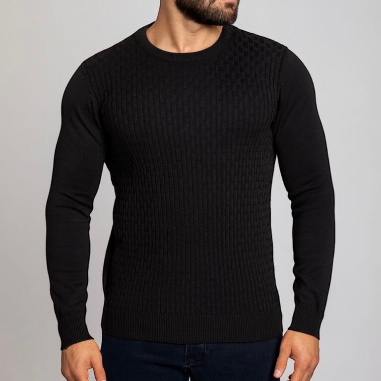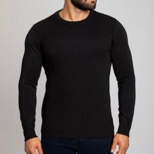Classic black sweater with a sleek textured finish. Stylish and adaptable for both casual and formal looks.