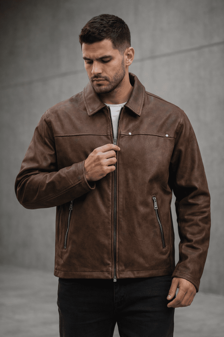 A modern zip-up jacket with a classic collar, designed in a timeless brown tone for a clean urban look. Its minimalist design and regular fit make it ideal for casual and smart-casual outfits, perfect for everyday wear.