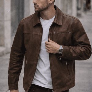 A modern zip-up jacket with a classic collar, designed in a timeless brown tone for a clean urban look. Its minimalist design and regular fit make it ideal for casual and smart-casual outfits, perfect for everyday wear.