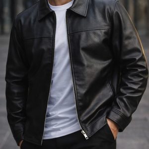 A premium black leather jacket designed with a clean and timeless aesthetic. The structured fit and minimal details create a strong, modern look that never goes out of style.
