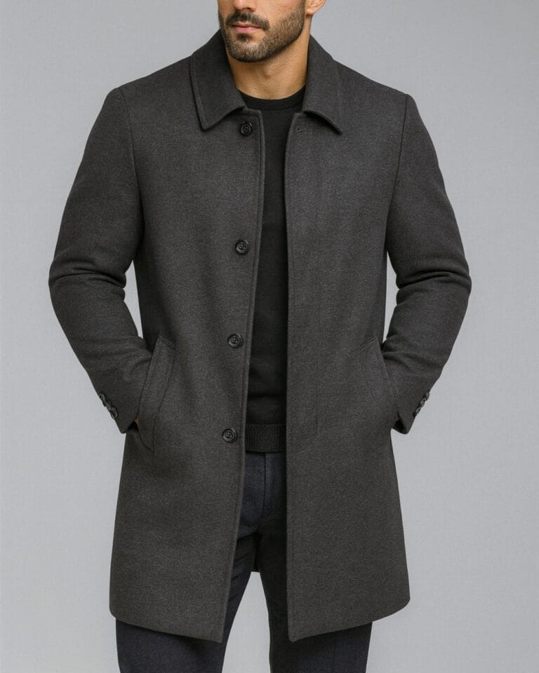 An elegant overcoat made from premium wool-blend fabric with a structured yet refined drape. Features a clean button-front design, soft collar, and versatile silhouette for an effortlessly smart appearance.