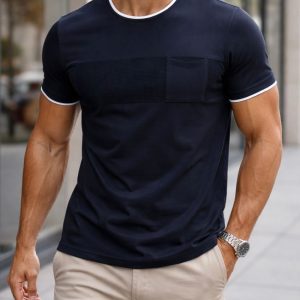 T-shirt premium në ngjyrë navy me detaje kontrasti në të bardhë dhe panel teksture në pjesën e gjoksit që krijon një pamje moderne dhe të veçantë. Xhepi i integruar dhe dizajni i pastër e bëjnë këtë model të dallueshëm nga maicat klasike.