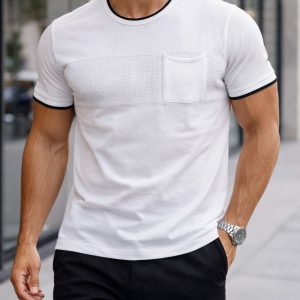 T-shirt premium në ngjyrë të bardhë me detaje kontrasti në të zezë dhe panel teksture në pjesën e gjoksit që krijon një pamje moderne dhe të pastër. Dizajni me xhep të integruar e bën këtë model të dallueshëm nga maicat klasike.
