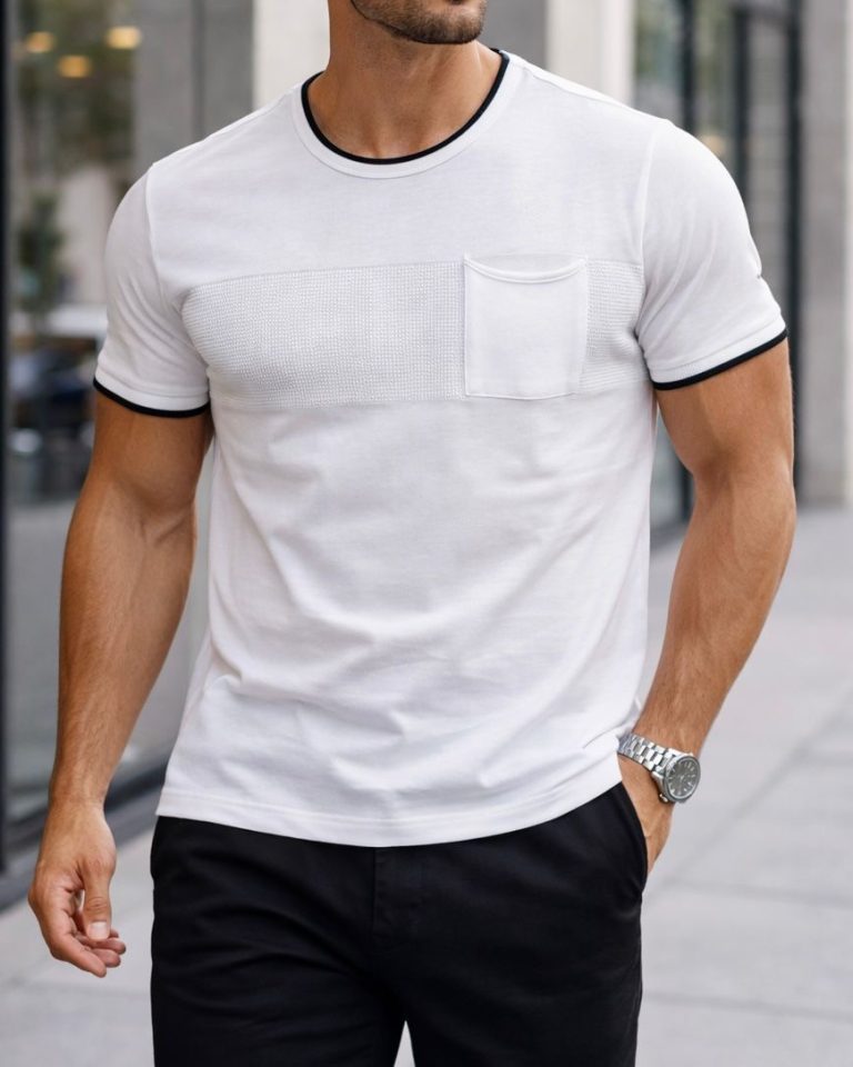 A premium white t-shirt featuring black contrast details and a textured chest panel that adds depth and a modern touch. The integrated chest pocket enhances the design, making it stand out from basic t-shirts.