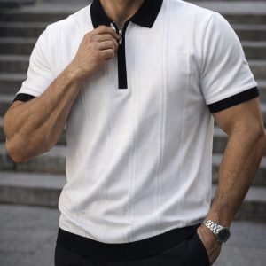 A premium white polo featuring black contrast details and a zip closure that delivers a modern and distinctive look. The vertical textured lines add depth, making this piece stand out from classic polos.