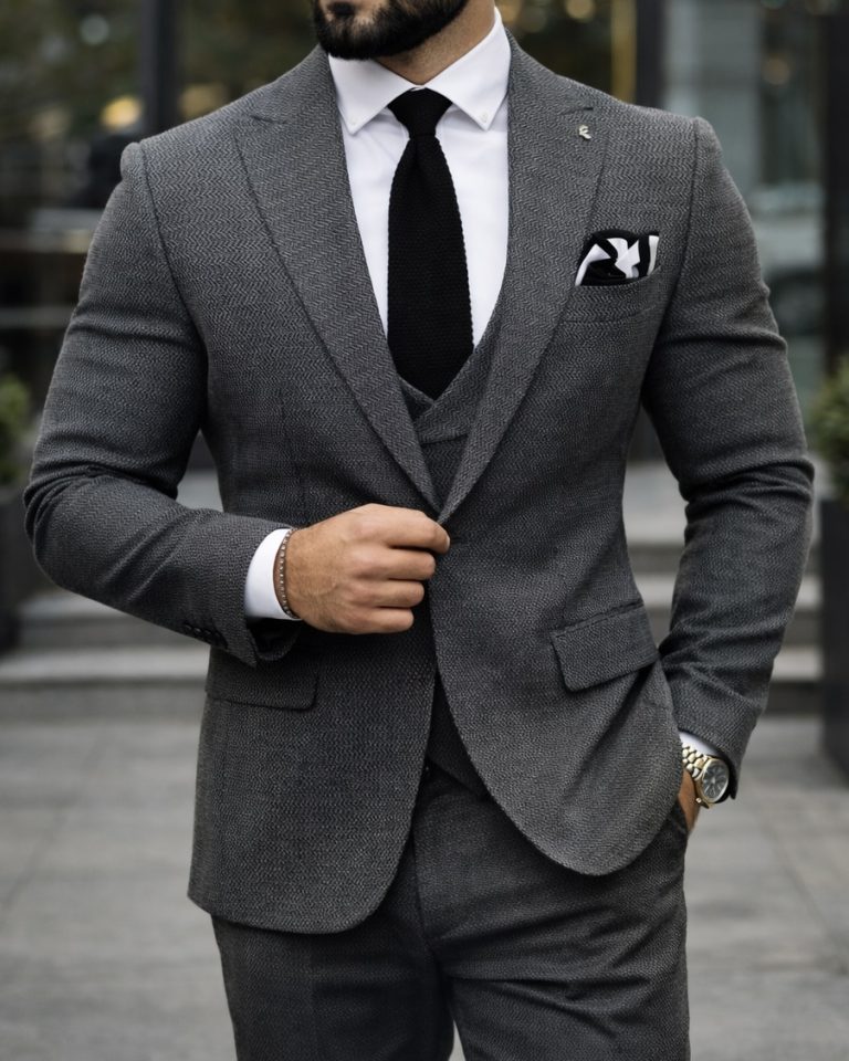 A premium dark grey textured suit designed for refined elegance and contemporary sophistication. Featuring a subtle patterned fabric and a sharp slim-fit cut, this three-piece suit delivers a powerful and polished appearance. Perfect for formal events, business occasions, and evening wear, it balances classic tailoring with modern style.
