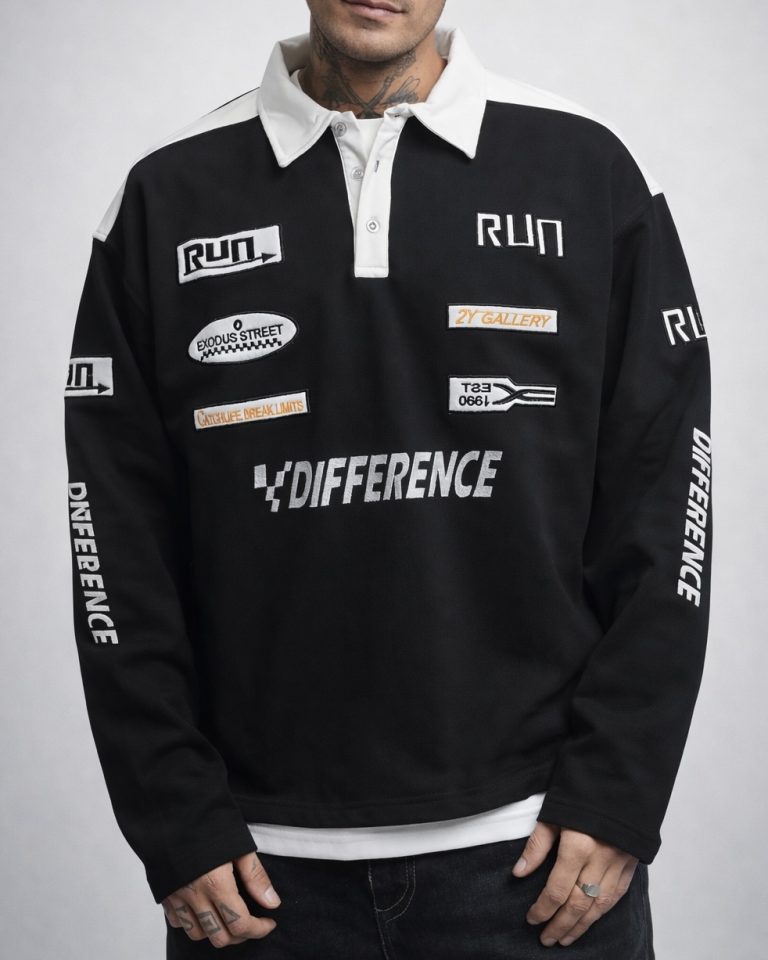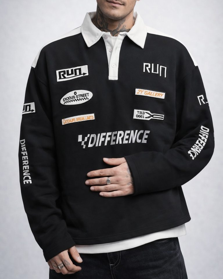 A bold urban sweatshirt designed to stand out through graphic detailing and modern streetwear aesthetics. Featuring a polo-style collar with button closure and multiple stitched graphic patches, this piece delivers a strong identity inspired by contemporary city culture.