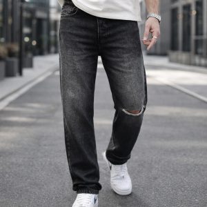 Dark grey washed jeans featuring a distressed knee detail that adds a modern urban edge. The clean design with a slightly faded finish creates a premium look, perfect for both everyday wear and casual outings.