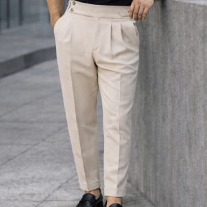 Beige tailored trousers designed with a double pleat front and side adjusters for a clean and refined look. The light tone creates a fresh and premium appearance, making them ideal for elevated and modern outfits.