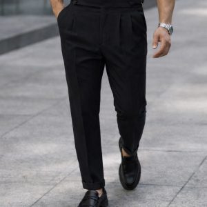 Black tailored trousers designed with a double pleat front and side adjusters for a sharp and structured look. The clean silhouette delivers a refined and modern style, making them a versatile piece for both casual and elevated outfits.
