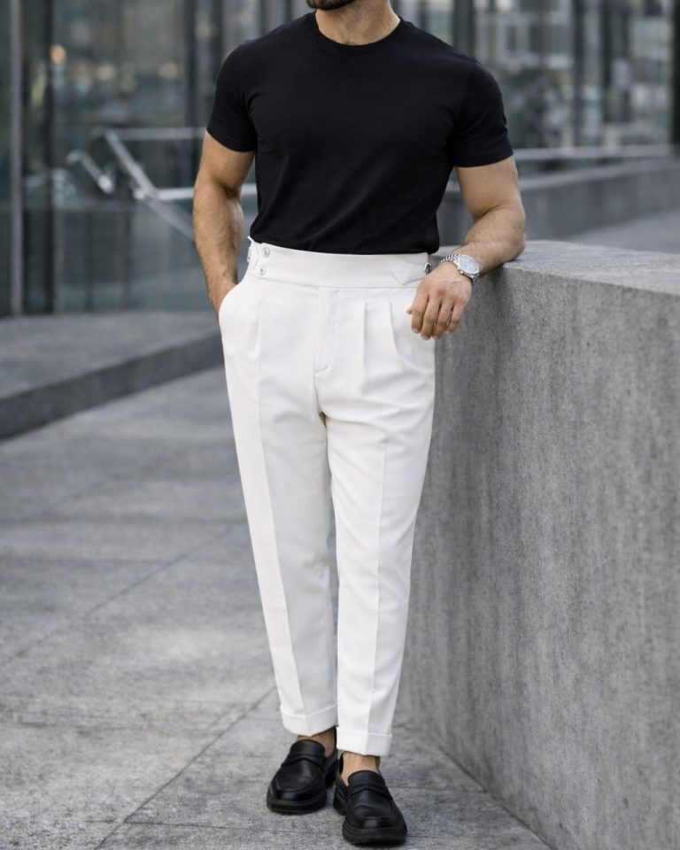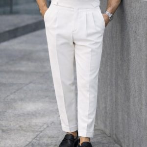 White tailored trousers designed with a double pleat front and side adjusters for a clean and refined look. The crisp white tone creates a sharp and premium appearance, making them a standout piece for modern and elevated outfits.