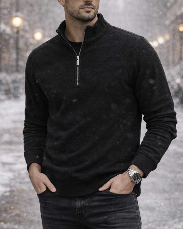 A premium half-zip knit sweater designed for a modern, elegant, and urban look. The black color delivers a bold and luxurious appearance, while the soft-touch fabric ensures maximum comfort and a refined feel. Perfect for minimalist, casual, or smart-casual winter styling.