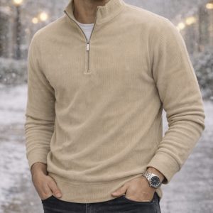 A premium half-zip knit sweater in a refined sand beige tone, designed for a clean, modern, and elegant look. The neutral shade delivers minimalist luxury and effortless styling, while the soft fabric ensures comfort and a premium feel throughout the day. Ideal for casual, smart-casual, or refined urban outfits.