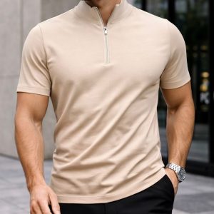 A premium beige polo featuring a high-neck collar with a zip closure, delivering a clean and refined look. The warm tone adds a subtle luxury feel, making it perfect for modern and versatile styling.