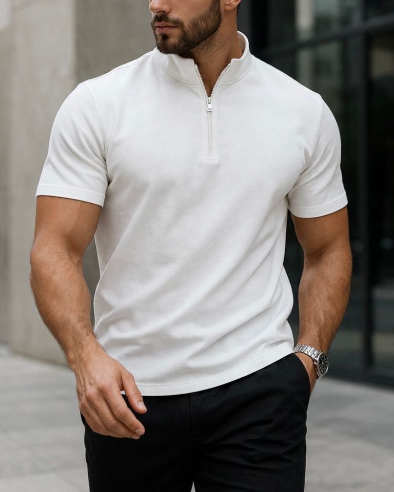 A premium white polo featuring a high-neck collar with a zip closure, delivering a clean and modern look. The minimalist design keeps it sharp and versatile, making it perfect for refined everyday styling.