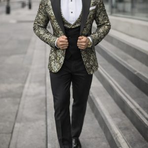 Set tuxedo ultra-luksoz me dizajn floral gold, i krijuar për të dalluar në çdo event formal. Xhaketa me print të artë dhe të zi, jeleku i kombinuar dhe pantallonat elegante formojnë një pamje premium dhe shumë të veçantë. Perfect për dasma, evente VIP, gala dhe mbrëmje festive ku kërkohet stil i fortë dhe prezencë e klasit të lartë.
