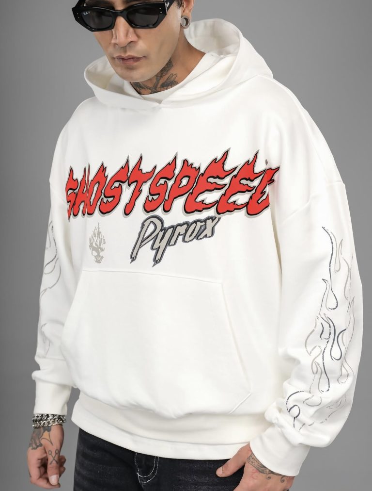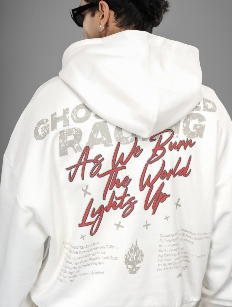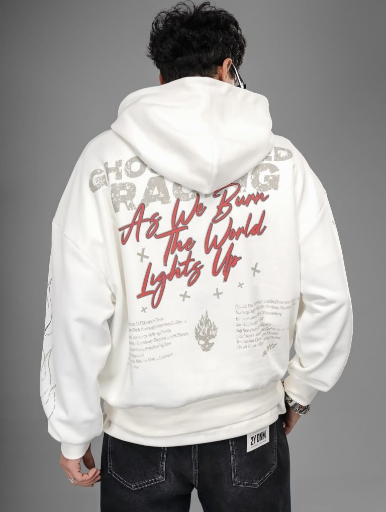 A bold oversized hoodie in milk-white, designed with high-impact front and back graphics. With its dropped shoulders, premium cotton blend, and street-inspired artwork, this piece delivers a standout look for everyday urban style.