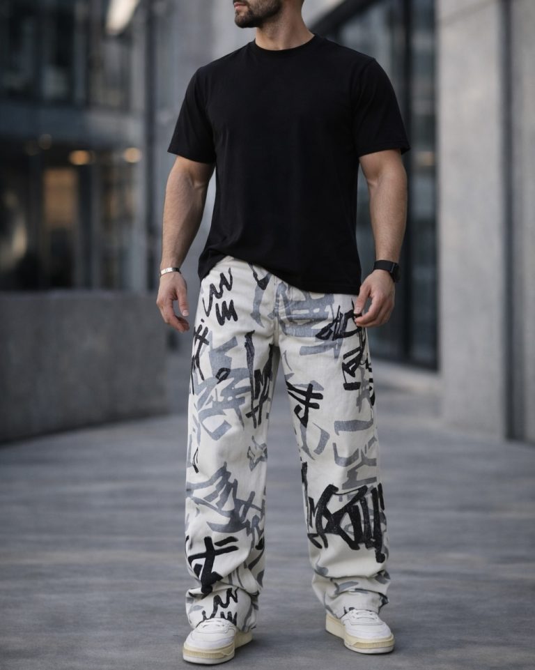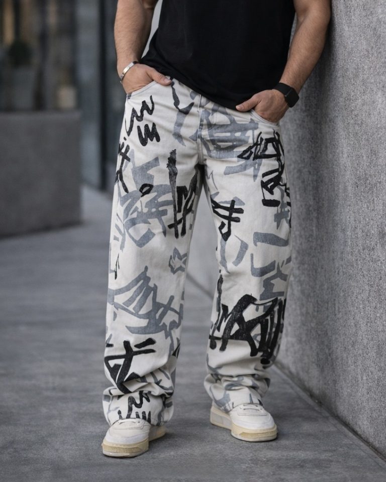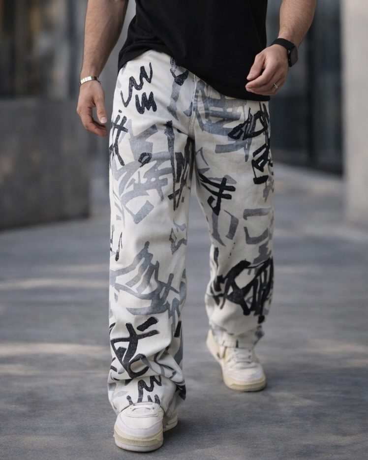 Pantolla streetwear në stil baggy me dizajn graffiti që krijon një look modern dhe të guximshëm. Printimet grafike në të gjithë sipërfaqen i japin një identitet unik dhe e bëjnë këtë model të dallohet menjëherë.
