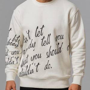 A premium white sweatshirt featuring an artistic handwritten print that reads “Don’t let anybody tell you what you should or shouldn’t do.”