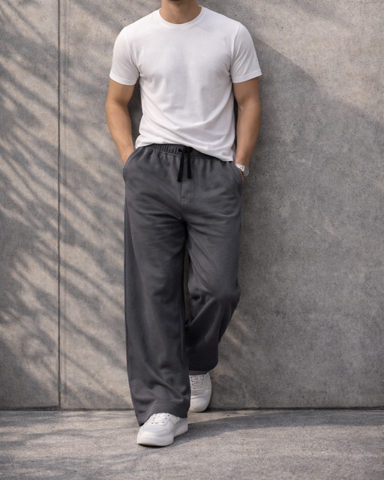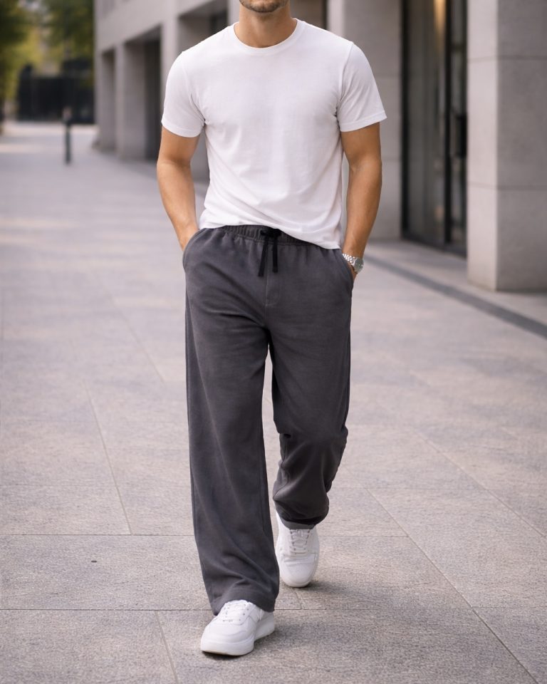 Trenerka të poshtme në ngjyrë grey me stil minimalist dhe pamje moderne. Dizajni relaxed dhe materiali i butë ofrojnë rehati të lartë gjatë veshjes duke i bërë perfekte për përdorim të përditshëm dhe kombinime casual.