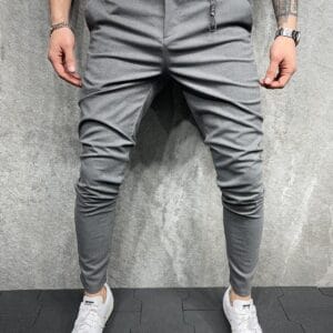 Modern tailored pants in a mid-grey tone, offering a clean structured fit and subtle texture.