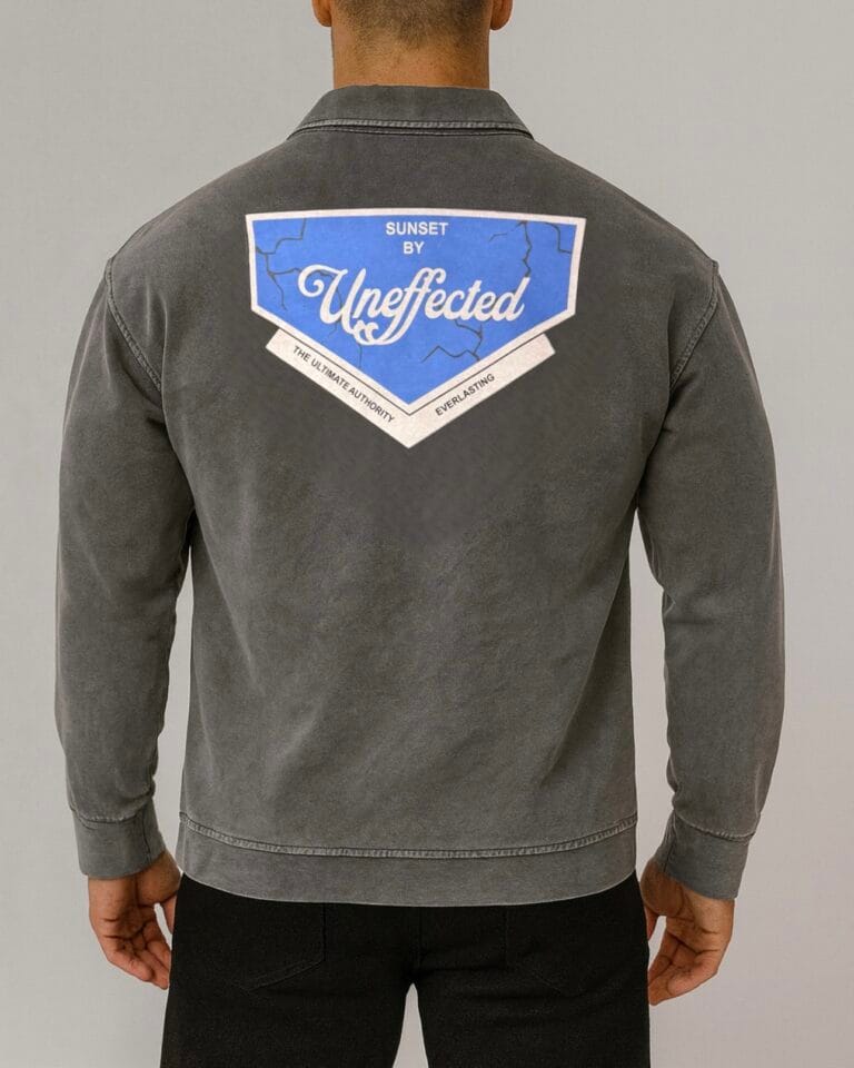 A retro-inspired half-zip sweatshirt in washed grey with “Uneffected” logo patches on chest and back. Built from premium cotton with a soft washed texture, combining comfort with vintage appeal.