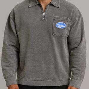A retro-inspired half-zip sweatshirt in washed grey with “Uneffected” logo patches on chest and back. Built from premium cotton with a soft washed texture, combining comfort with vintage appeal.