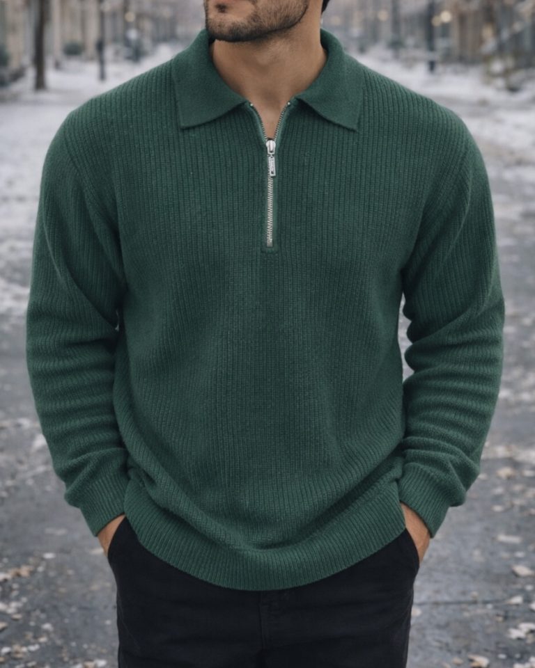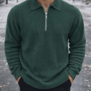 A refined half-zip knit sweater designed for modern urban style. The textured knit fabric provides warmth and comfort, while the deep forest green tone adds a sophisticated and natural touch to everyday and smart casual outfits.