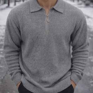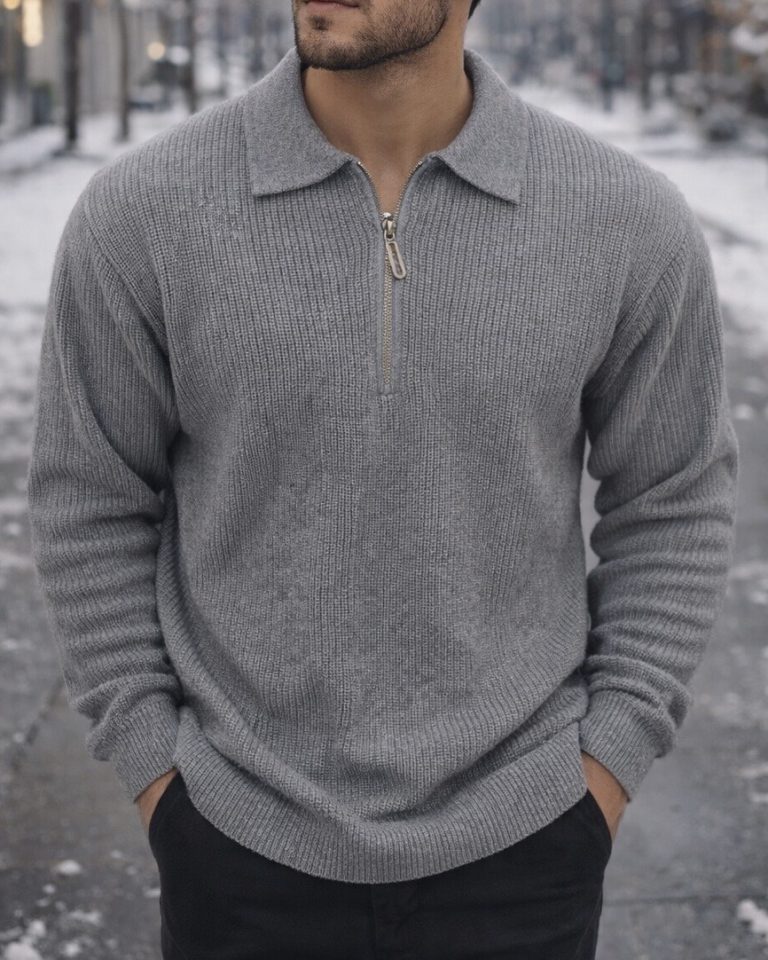 A modern half-zip knit sweater designed for clean urban style. The textured knit construction provides warmth and comfort, while the minimalist silhouette makes it perfect for everyday wear and smart casual combinations.