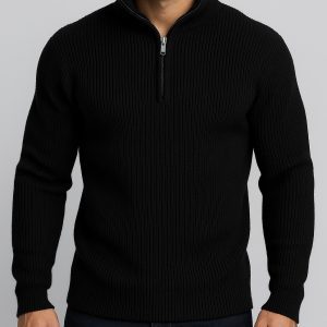 A sleek, minimal half-zip sweater in deep black. The ribbed knit structure and raised collar deliver a clean, modern look with exceptional comfort and warmth — ideal for both casual and smart styling.