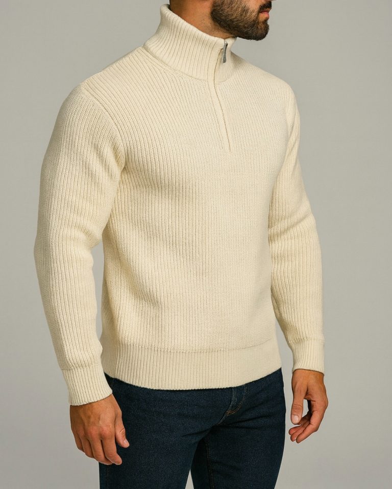 A clean and elevated half-zip sweater in a refined Milk White tone. Crafted with a premium ribbed texture, it delivers warmth, softness, and a modern minimal look — ideal for everyday layering or polished winter outfits.