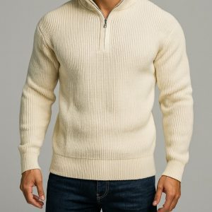 A clean and elevated half-zip sweater in a refined Milk White tone. Crafted with a premium ribbed texture, it delivers warmth, softness, and a modern minimal look — ideal for everyday layering or polished winter outfits.