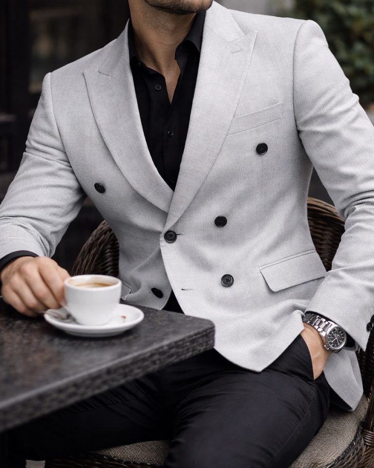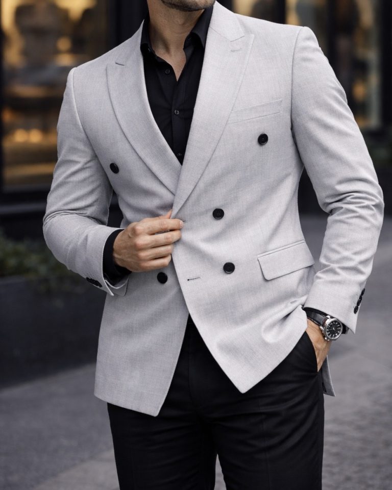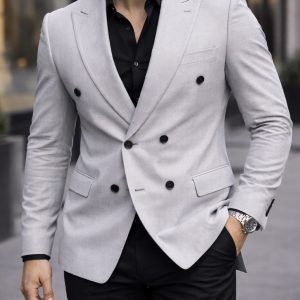 An elegant ivory grey blazer featuring a double-breasted design that delivers a clean, modern, and refined look. The light tone enhances contrast when paired with darker outfits, creating a sharp and premium aesthetic.