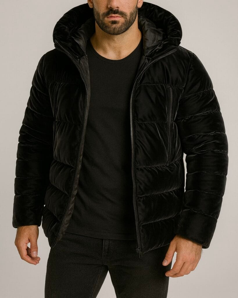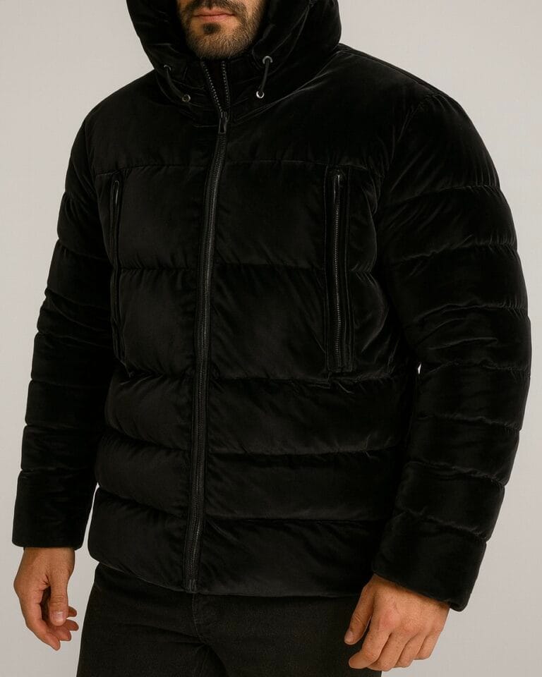 Xhup modern puffer me pamje lëkure dhe kapuç të heqshëm. Ka dizajn të qepur me jastekë, material të lëmuar dhe formë elegante për shtresim dimëror me stil.