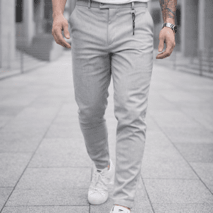 Light grey pants crafted from smooth flexible material for a minimal, elevated look.