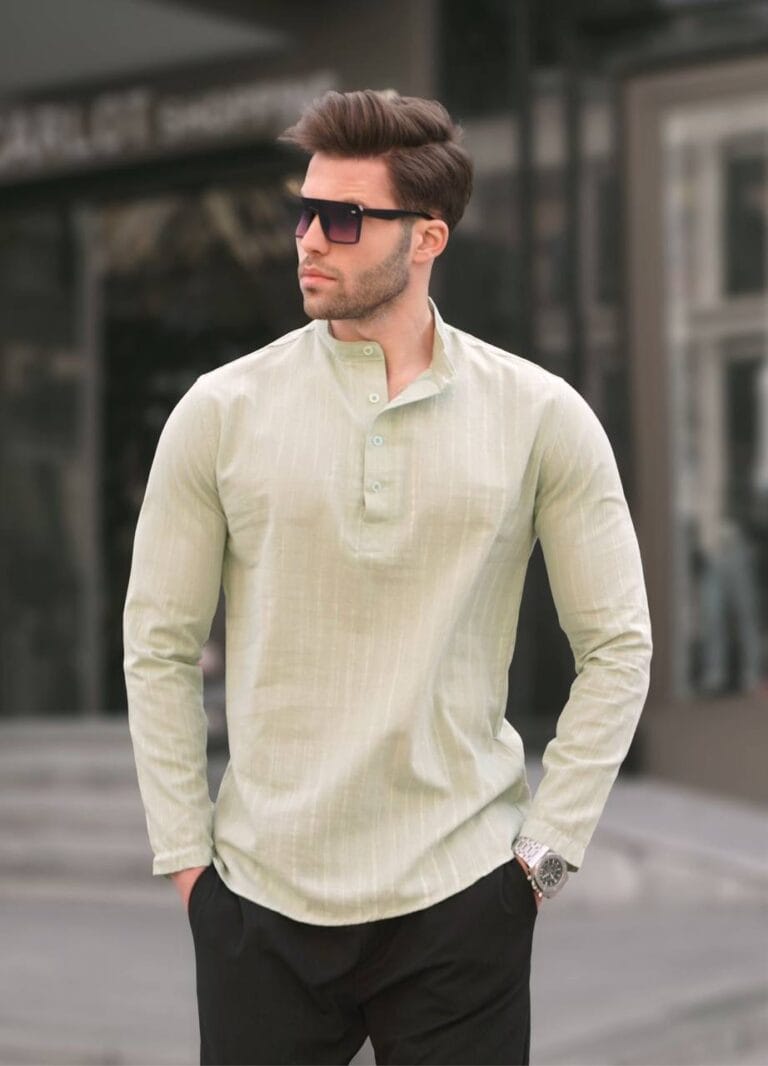Elegant light sage shirt crafted from breathable linen-blend fabric. Designed for a relaxed yet refined summer look.
