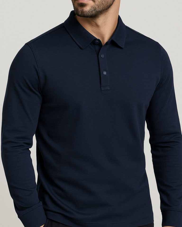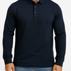 A deep navy long-sleeve polo with a premium finish. Clean, timeless, and perfect for day-to-night styling.
