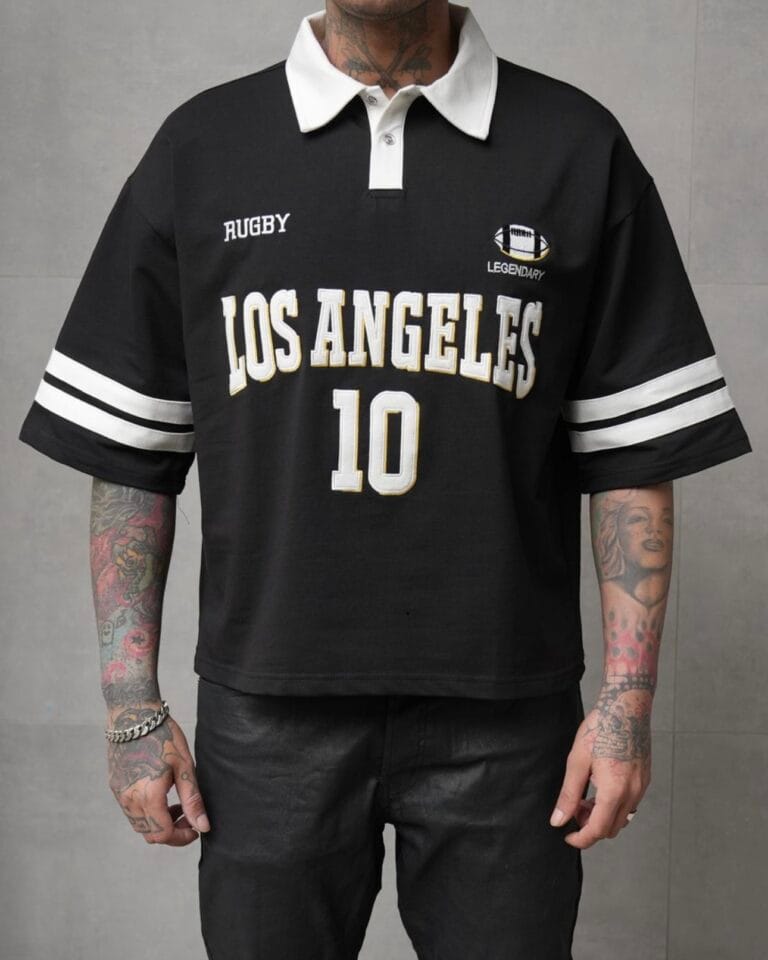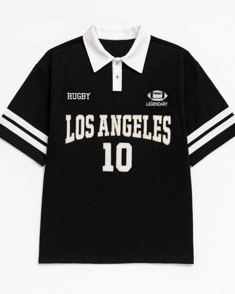A statement rugby polo crafted from heavyweight cotton with bold collegiate embroidery. Features contrast white collar and sleeve stripes for a distinctive vintage-athletic look.