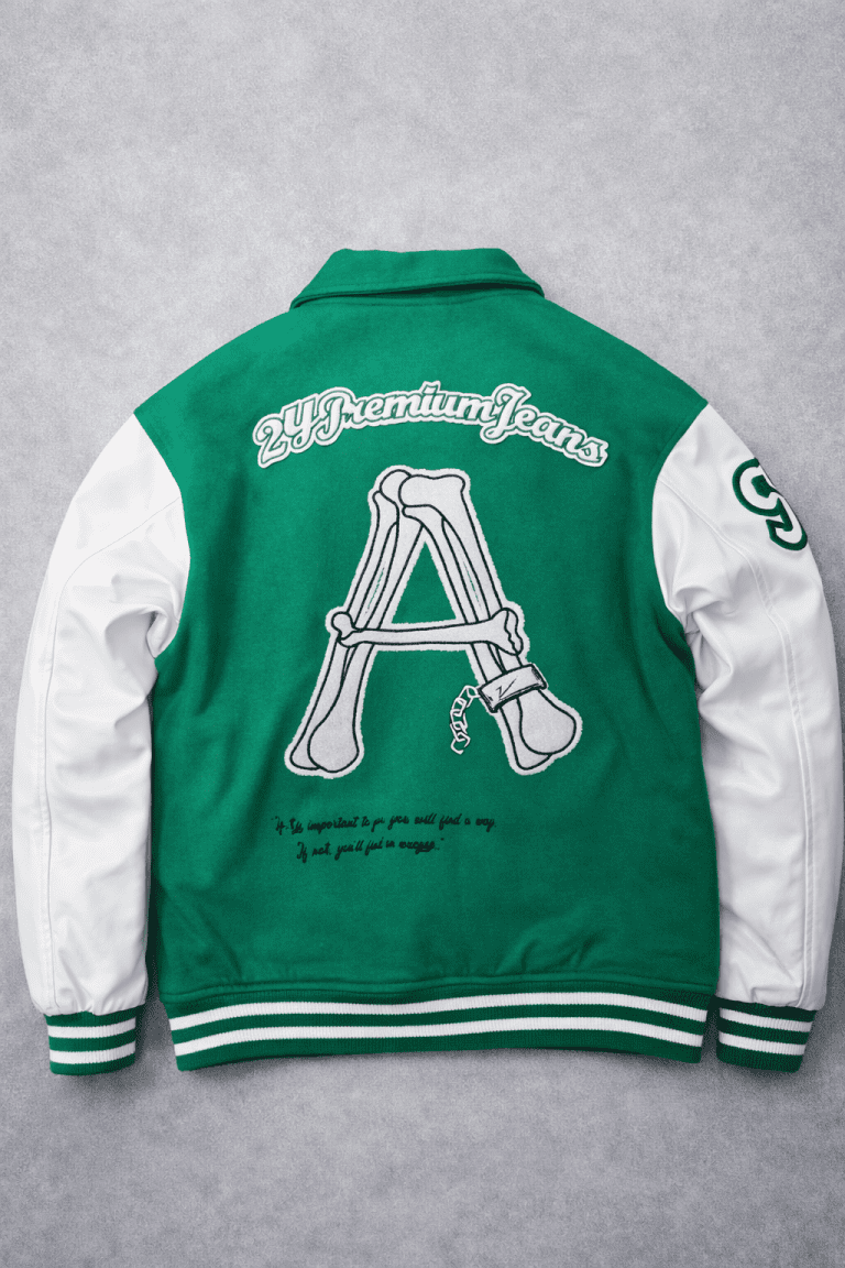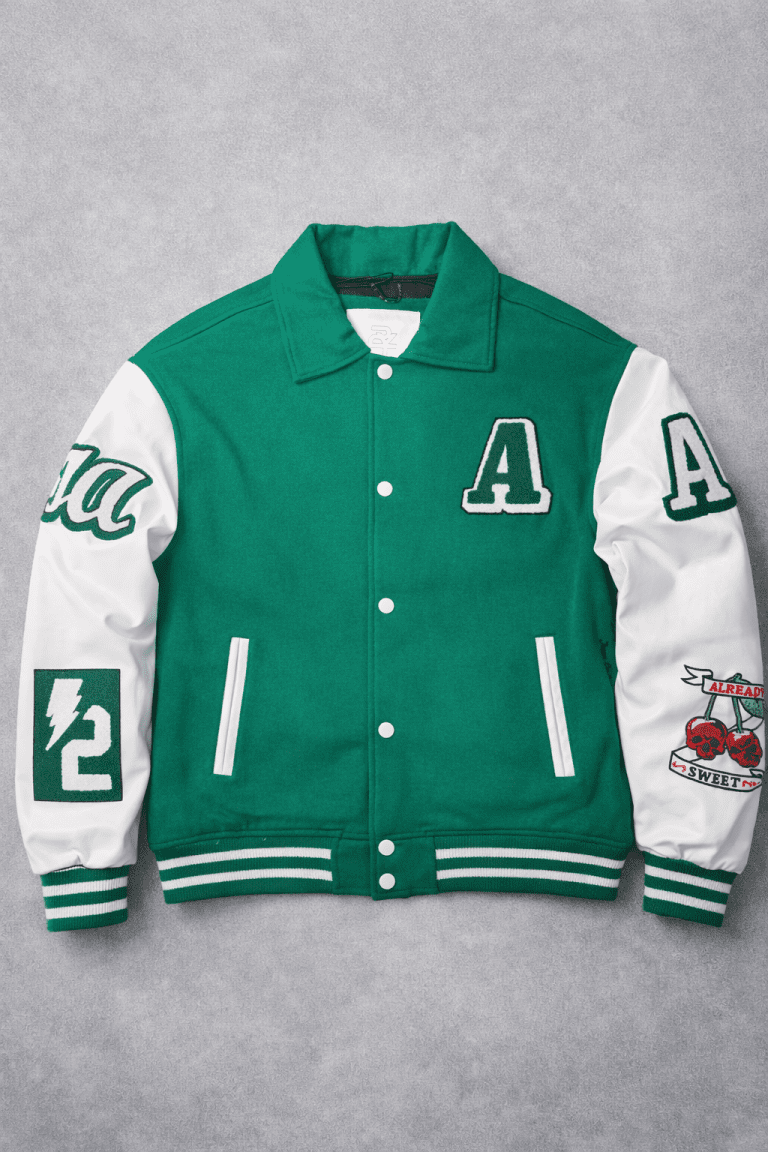 Xhaketë varsity me stil luksoz dhe pamje të rafinuar, e dizajnuar për një garderobë moderne dhe elegante. Trupi me përzierje leshi në ngjyrë jeshile dhe mëngët kontrastuese krijojnë një siluetë të fortë, por të pastër, duke e bërë këtë model ideal për kombinime casual premium.