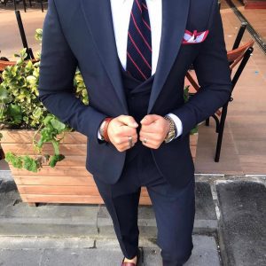 Set kostum premium në ngjyrë Navy Blue, perfekt për meshkuj që duan stil elegant, klasik dhe modern njëkohësisht. Prerja slim-fit, jeleku i kombinuar dhe pantallonat e qepura me linjë të pastër krijojnë një siluetë të fuqishme dhe shumë profesionale. Ideal për dasma, evente zyrtare, darka elegante dhe takime biznesi.