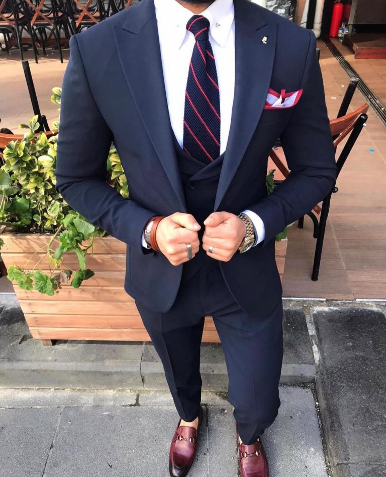 A refined navy blue suit set crafted for men who appreciate timeless elegance and modern tailoring. The slim-fit jacket, coordinated vest, and clean-cut trousers create a sharp and sophisticated silhouette. Perfect for weddings, business meetings, formal events, and stylish evening looks.
