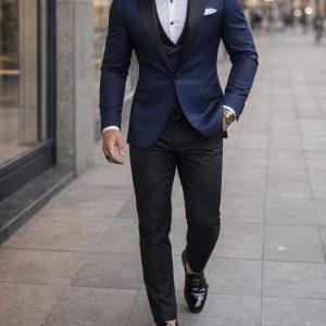 Kostum smoking luksoz në ngjyrë blu navy, i krijuar për raste shumë formale dhe evente të veçanta. Detajet satin në jakë dhe prerja e pastër i japin një pamje shumë elegante dhe ekskluzive, ideale për dasma, gala dhe mbrëmje formale.