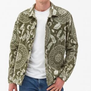 Olive overshirt with unique circular and ethnic-inspired motifs. A statement piece with a boho-urban touch for standout style.