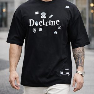 T-shirt oversized me dizajn grafik konceptual të frymëzuar nga elemente shkencore dhe vizuale moderne. Pjesa e përparme ka tipografi të pastër “Doctrine” me detaje të lehta, ndërsa pjesa e pasme përmban një grafik të theksuar me stil atomik që krijon një efekt të fortë vizual.